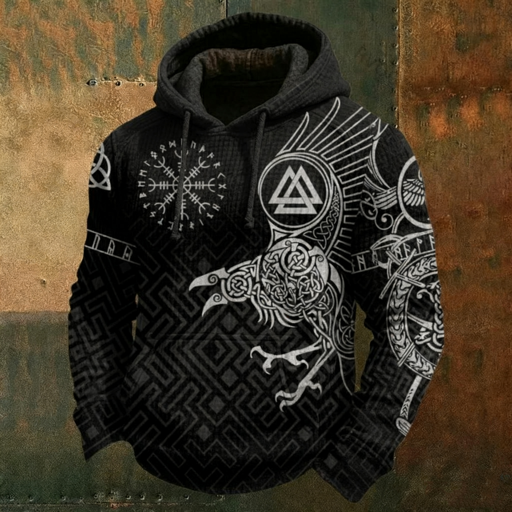 Nordic Viking Style Raven Runes Casual Long-sleeve Waffle Hoodie