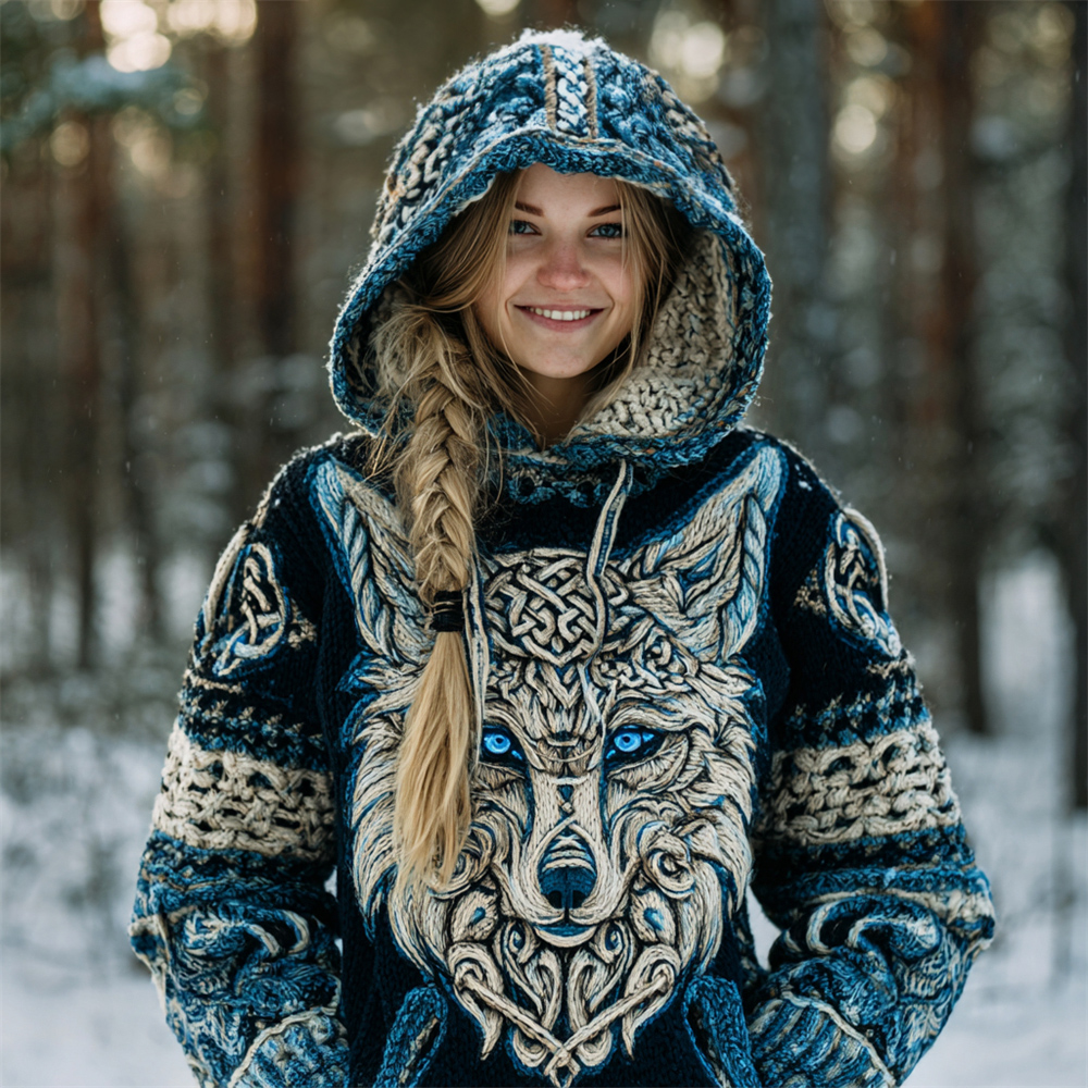 Viking Blue-eyed Wolf Totem Art Women's Knit Hooded Sweater