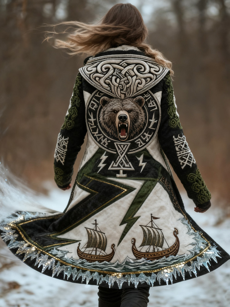 Viking Tribal Totem Embroidery Print Hooded Long Cardigan