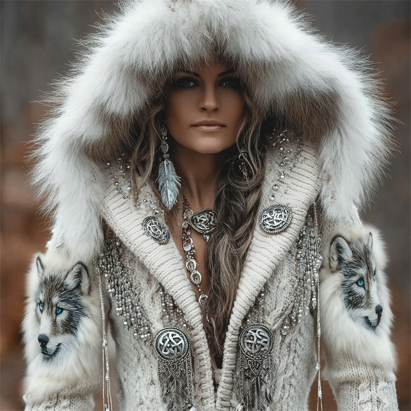 Vintage Western Wolf Beaded Tassels Fur Trim Hooded Cardigan