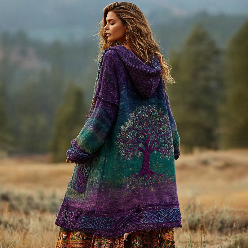 Women's Viking Celtic Knot Tree Of Life Knitted Long Hooded Cardigan