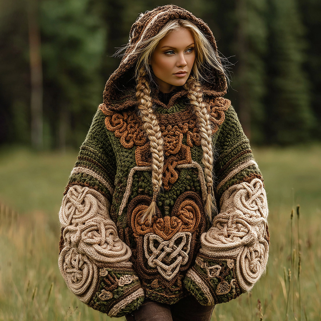 Women's Vintage Celtic Knot Jacquard Contrast Hooded Sweater
