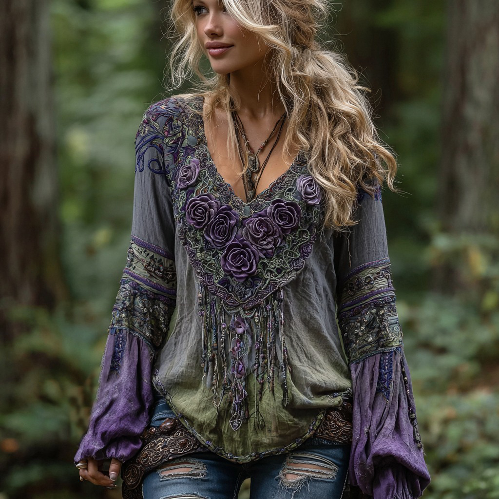 Women's Vintage Tribal Tassel Rose Embroidery Art Pattern Linen Shirt