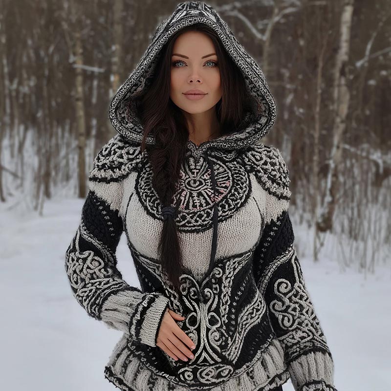 Women's Vintage Viking Rune Knit Jacquard Hooded Sweater
