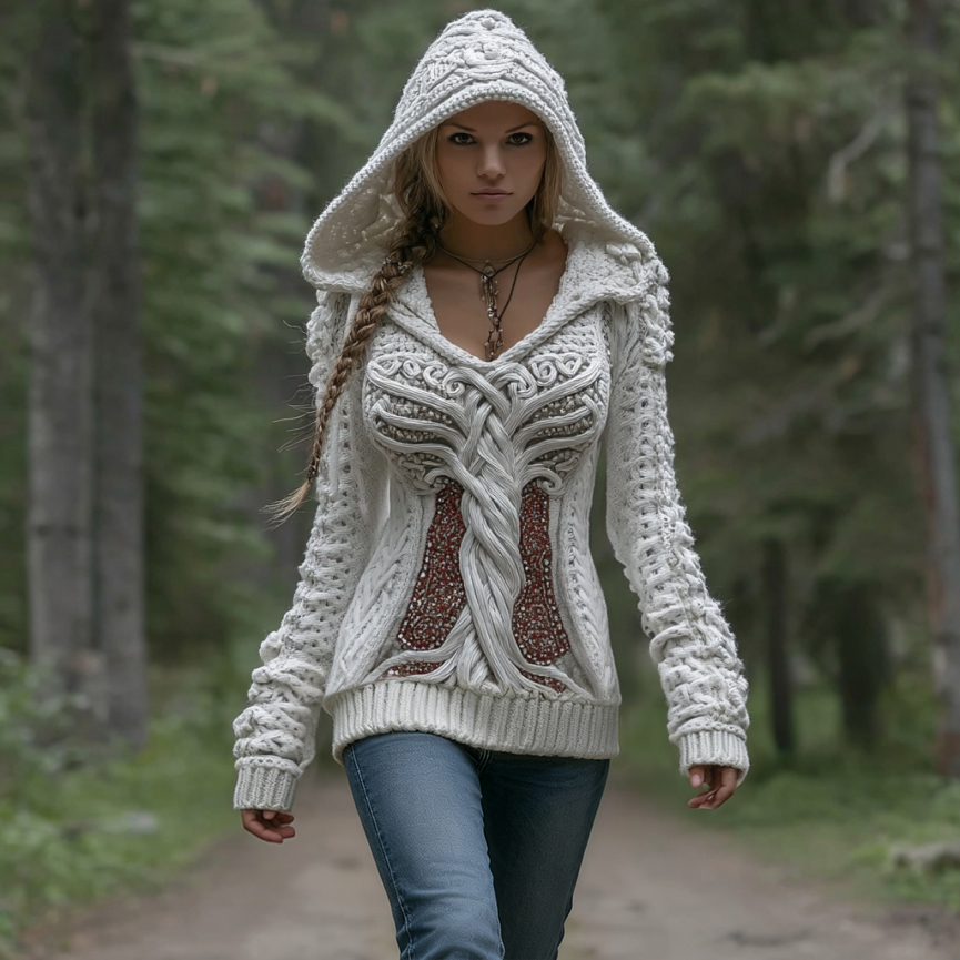Women's Vintage Viking Tree Of Life Art Knit Jacquard Hooded Sweater